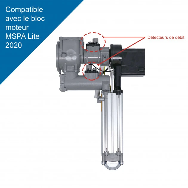 Il y a 2 détecteurs de débit par bloc moteur de spa gonflable MSPA Lite 2020 : un à l’aspiration , l’autre au refoulement. (voir l’image ci-dessous)